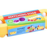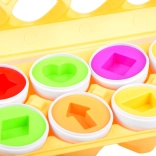 Deze slimme set bevat 12 witte eitjes in een gele plastic tray. Binnenin vinden kinderen gekleurde helften met vormen die ze correct moeten koppelen op kleur en vorm (bijv. ster, hart, cirkel, vierkant en meer). Het spel ondersteunt de vroege vaardigheidsontwikkeling en leert geduld en concentratie.