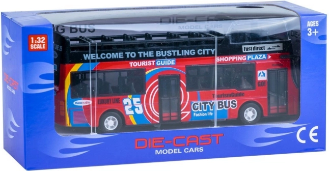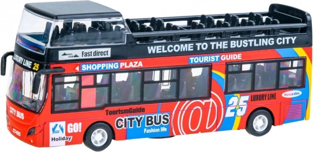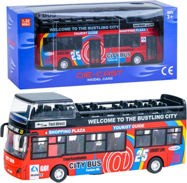 Een realistische metalen dubbeldeksbus met schuifdeuren die open kunnen, verlichting en geluiden zal elke kleine chauffeur blij maken. Hij heeft een frictie-aandrijving (pull-back), lichteffecten, motor-, rij- en claxongeluiden en een duurzame metalen-kunststof constructie.