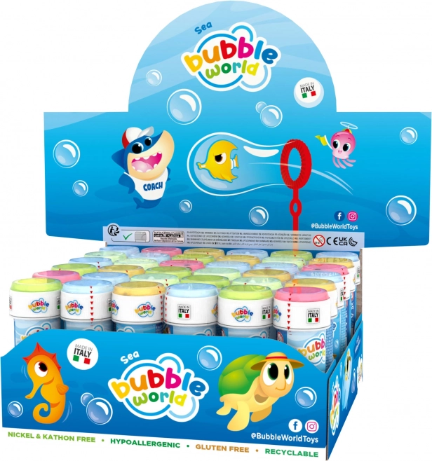 De bubbelblazer Waterwereld biedt urenlang plezier voor zowel kinderen als volwassenen. Met een inhoud van 60 ml is het ideaal voor speeltijd buiten en binnen. Dankzij de kleurrijke dop met een geïntegreerd spel zul je je nooit vervelen. Het maken van bellen is eenvoudig en leuk dankzij het praktische blaaspijpje in de dop.