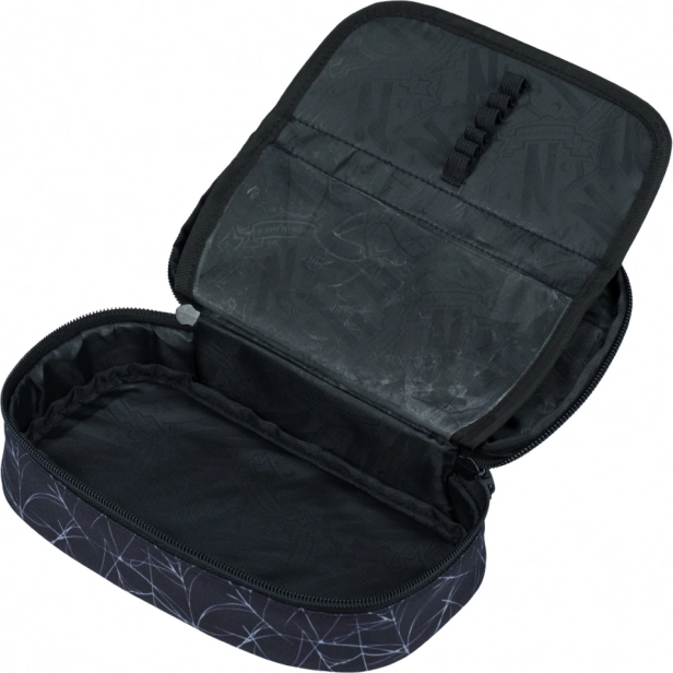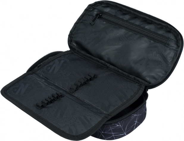 Dankzij de slimme interne indeling heb je potloden, pennen, gum en kleine accessoires altijd overzichtelijk geordend. Stijlvolle details en de diepzwarte uitvoering met Nevermore-motief maken je schooluitrusting compleet.
