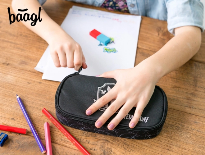 Deze BAAGL-schooletui in de iconische Wednesday-stijl combineert een aantrekkelijke look met praktische organisatie. De stevige constructie beschermt schrijfbenodigdheden, terwijl de uitklapbare scheidingsflap en binnenvakken alles netjes op zijn plaats houden.