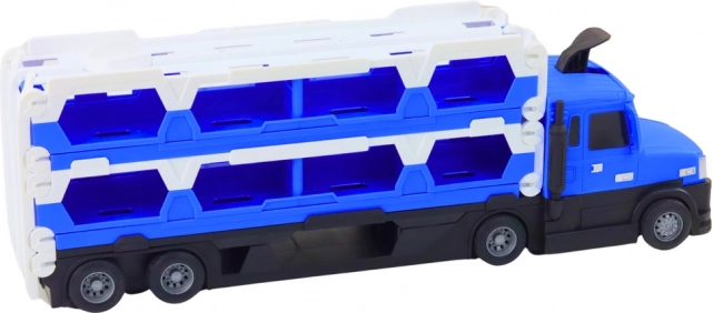 Deze multifunctionele vrachtwagen in aantrekkelijk blauw combineert een autotransporter en een 2-in-1 racebaan. Uitgeklapt krijg je een baan tot wel 211 cm lang, ideaal voor dynamische duels en het oefenen van rijvaardigheden. Realistische lichten en geluiden versterken de sfeer van echte races.