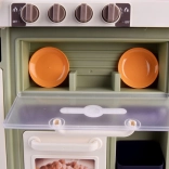 Deze ruime kunststof keuken in moderne kleuren maakt elk kind blij dat van kokerspel houdt. Realistische elementen zoals oplichtende kookplaten, kookgeluiden en veilige stoom uit de branders zorgen voor een authentieke beleving. Dankzij de werkende kraan met een gesloten watercircuit kunnen kinderen afwassen en “kruiden” water geven.