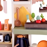 De interactieve LED-afzuigkap met melodieën, de eierkoker met licht en geluid en het krijtbord voor het menu stimuleren fantasie en fijne motoriek. De keuken biedt veel opbergruimte – planken, lades, haken – en een rijke set servies, etenswaren en kruiden voor eindeloze rollenspellen.