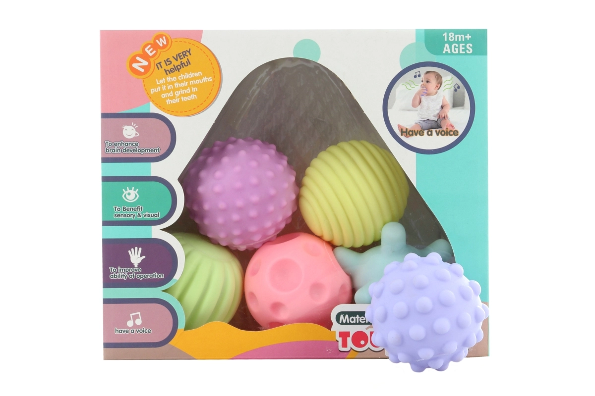 Set sensorische balletjes voor de allerkleinsten. De balletjes hebben verschillende vormen en kleuren. De balletjes piepen. Verpakt in een doos. Afmetingen van de verpakking ca. 21×18×7 cm. Grootte van de balletjes ca. 5–6 cm. Leeftijd 18m+