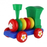De trein is gemaakt van plastic in felle kleuren die de aandacht van kinderen trekken, en versierd met bloemmotieven op de wielen.