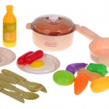 De set van 28 onderdelen bevat een pan met deksel, koekenpan, bordjes, bestek en een brede selectie etenswaren. Kinderen kunnen naar eigen fantasie ontbijt, lunch en diner bereiden.