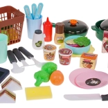 . | - grote keuken, .- bord, .- krijtbord, .- spons, .- pan met deksel, .- koekenpan met deksel, .- mand, .- kom, .- 2 x mok, .- theepot, .- zoutstrooier, .- 2 x kruidenpotje, .- peperstrooier, .- sojasaus, .- hete saus, .- zoetzure saus, - ketchup, .- 2 x jam, .- 2 x sandwich, .- 2 x bord, .- 1 x schaal, .- komkommer, 5 paprikaschijfjes, banaan, 2 wortelschijfjes, wortel, 2 slablaadjes, 2 x erwtjes, 2 uienringen, 2 broccoliroosjes, maïs, aardappel, peer, .- lepel, vork, mes, .- soeplepel, schuimspaan, spatel, pastalepel, hakmes, .- afwasmiddel, .- kartonnen pakjes melk, sap, koekjes, hamburgers, hamburgers, .- stickervel. |