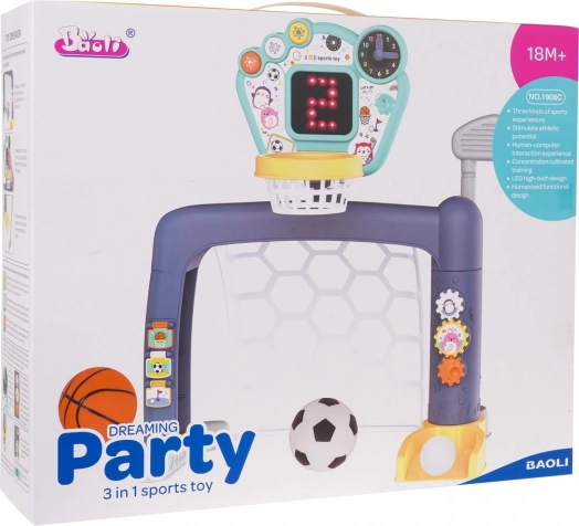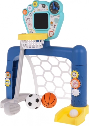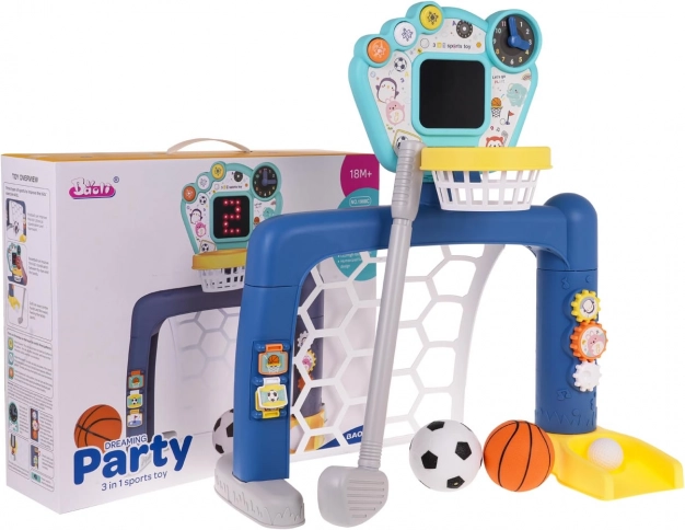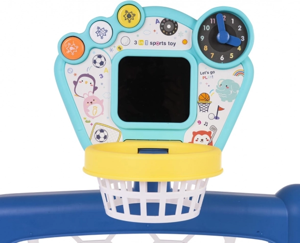 Interactieve 3-in-1 set voor voetbal, basketbal en golf, voor kinderen vanaf 18 maanden. Op het paneel staan drie knoppen om tussen modi te schakelen. Het speelgoed werkt op 3 AA 1,5 V-batterijen (niet inbegrepen).