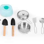 10 stuks (pan, deksel, koekenpan, spatel, zeef, soeplepel, gieter, 3× tuingereedschap)