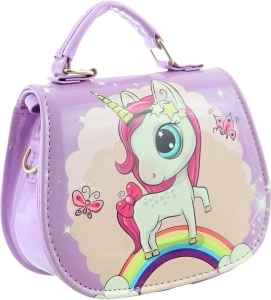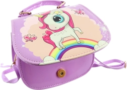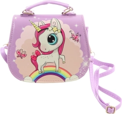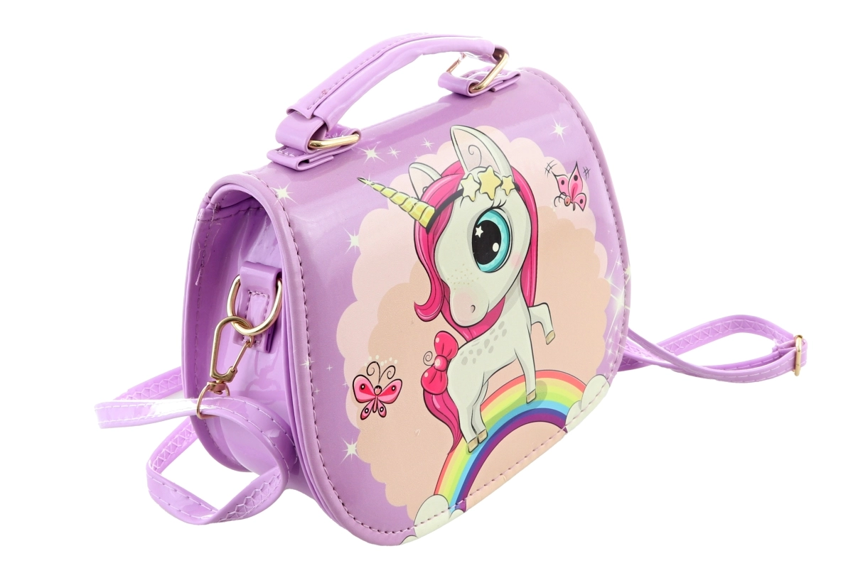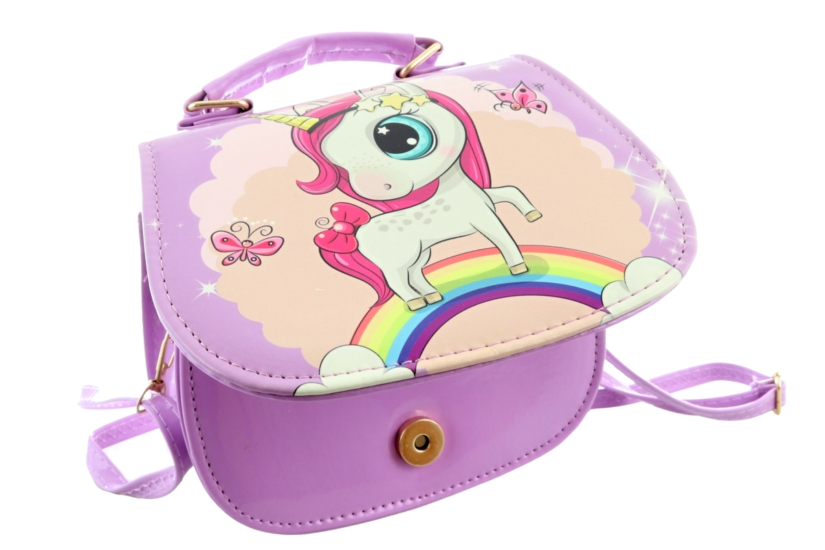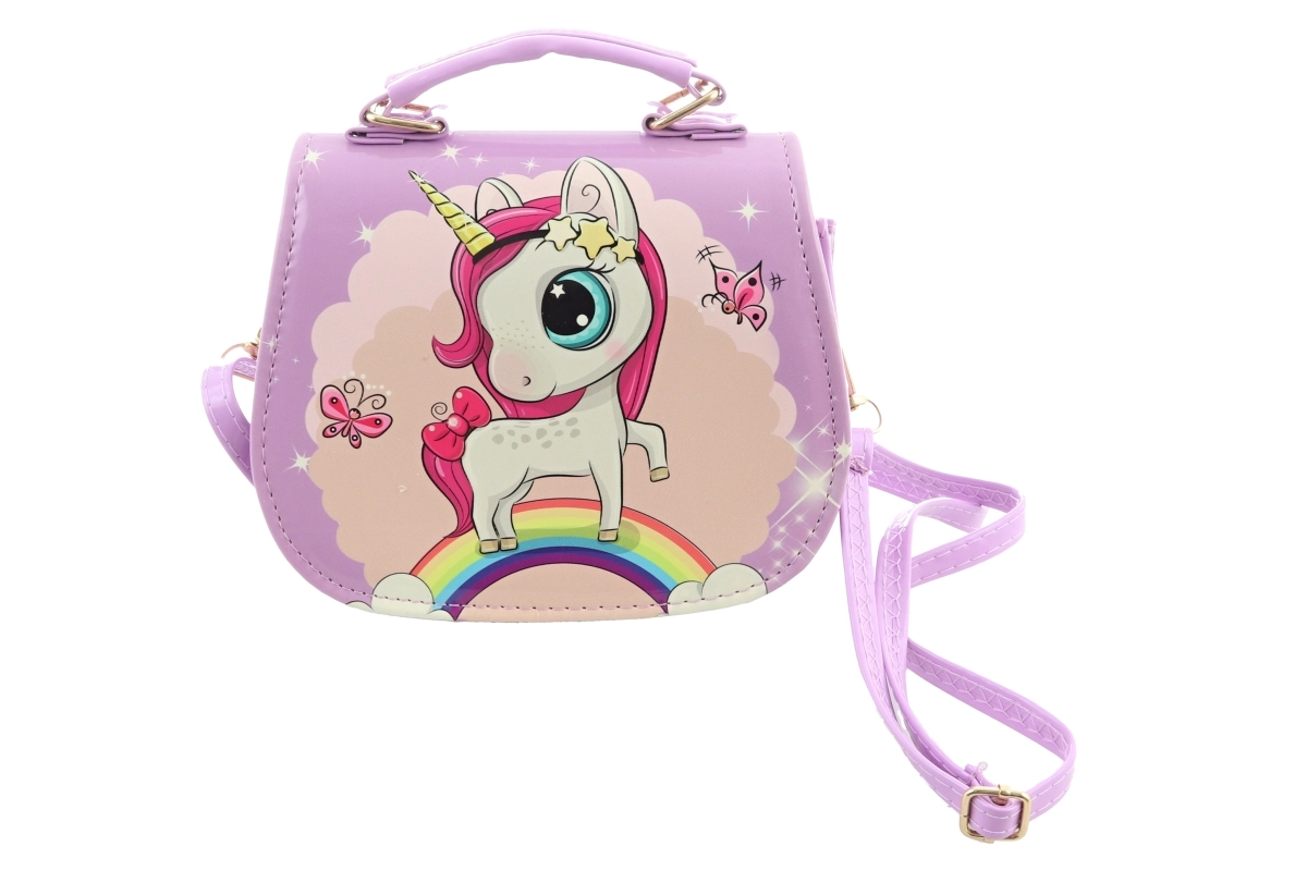 Paarse handtas met eenhoornmotief. De tas heeft binnenin 1 vak. Sluiting met drukknoop. Afmetingen van de tas ca. 18 × 14 × 8 cm. Leeftijd 3+.