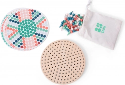 Houten bord, stevige pinnetjes en een katoenen tas voor transport en opslag. Het spel biedt urenlang creatieve speelpret.