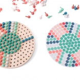 Dit houten mozaïekspel ontwikkelt de vaardigheden van kinderen op speelse wijze. Dankzij het brede palet aan pinnetjes kunnen kinderen afbeeldingen leggen volgens 6 dubbelzijdige sjablonen of eigen, originele patronen maken. Het stevige houten bord en de hoogwaardige materialen zorgen voor een lange levensduur en veilig gebruik.