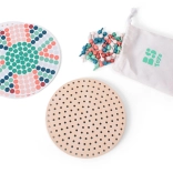 1 rond bord, 217 pinnetjes, 6 dubbelzijdige voorbeeldkaarten, katoenen tas