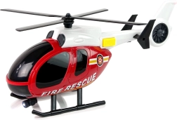 .De grote rode helikopter heeft beweegbare en draaiende rotorbladen die met de hand in beweging kunnen worden gezet, waardoor de indruk van vliegen ontstaat. De spanwijdte bedraagt tot 20 cm. Aan de zijkant van de helikopter zit een knop die licht- en geluidseffecten activeert, zodat het spelen nog leuker wordt! Het geluid van opstijgen en vliegen zorgt voor een realistischer gevoel.