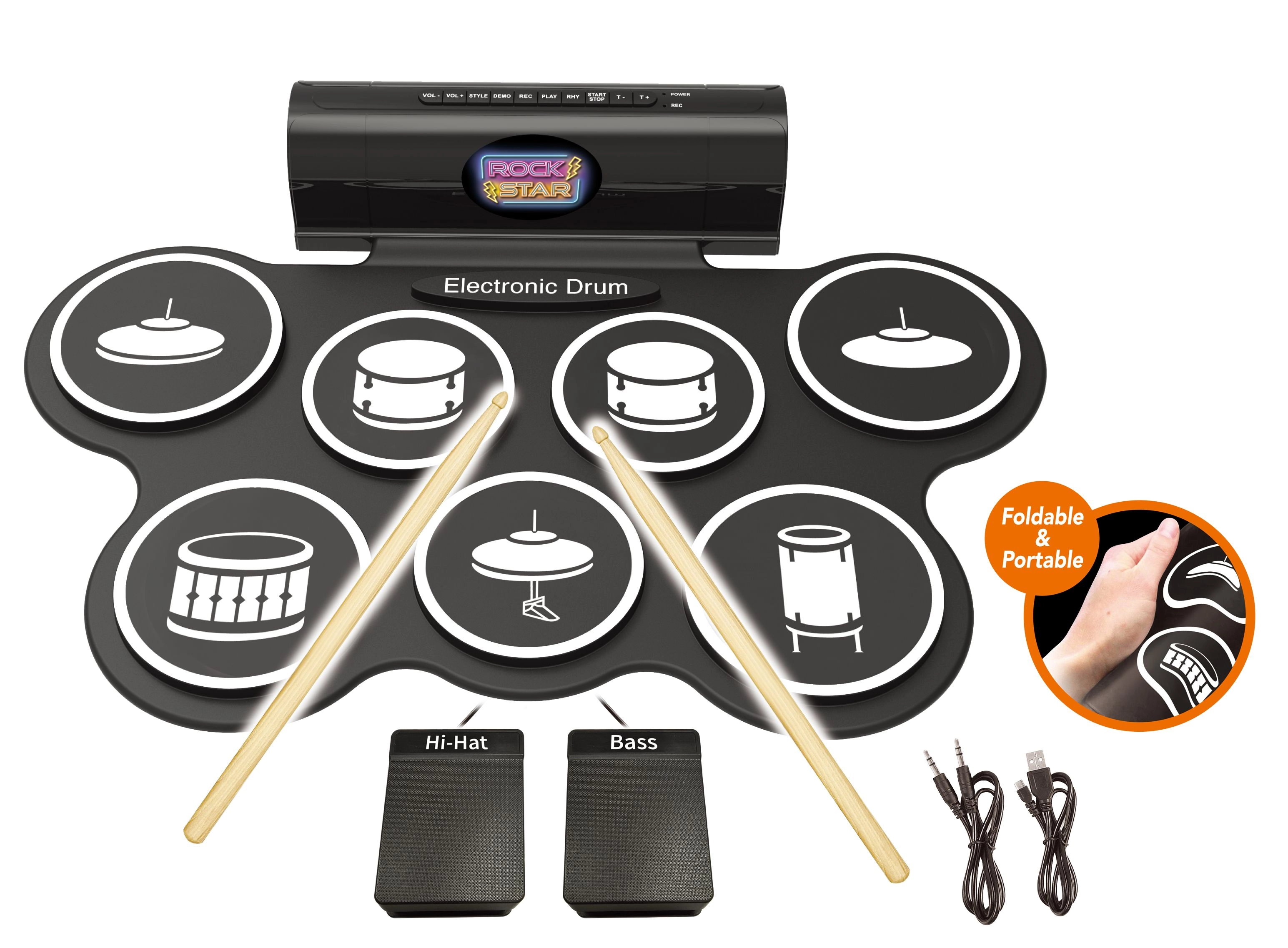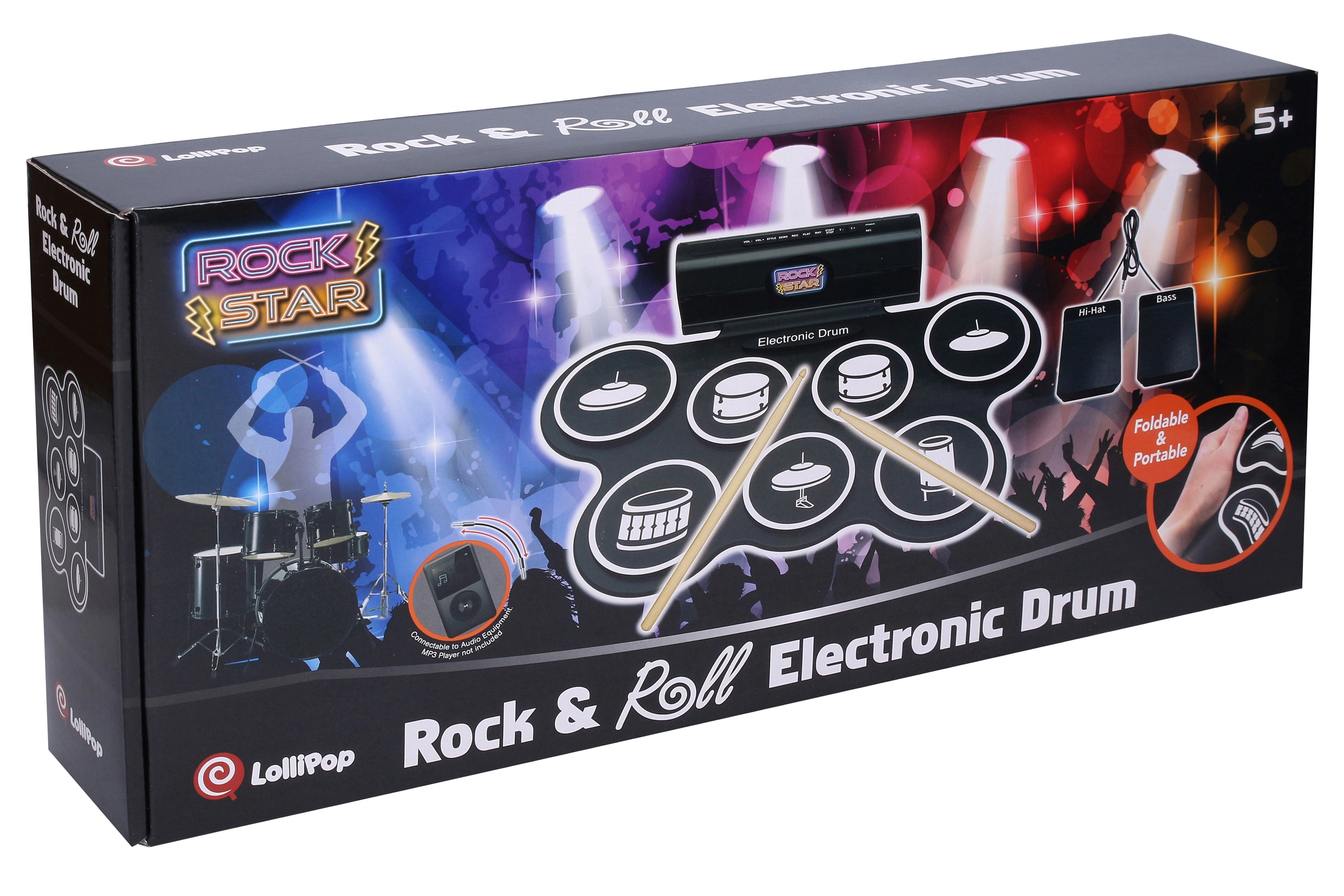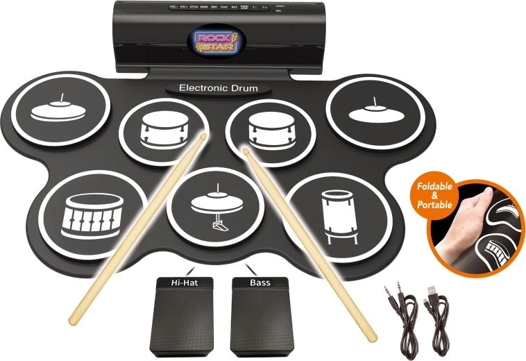 Compact elektronisch drumstel voor thuis en beginners met 7 realistische sounds, 2 pedalen (hi-hat en basdrum), licht- en geluidseffecten en de mogelijkheid om op te nemen en af te spelen. In de verpakking zitten 3× AA-batterijen, een USB‑kabel en een kabel voor mobiel/mp3.