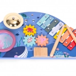 De muziektafel is rijkelijk versierd met oceaanmotieven en heeft kleurrijke elementen die direct de aandacht van het kind trekken.