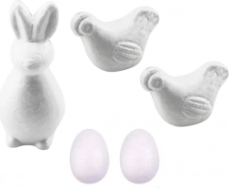 Paasset schilderpakket voor polystyreendecoraties biedt plezier voor zowel kinderen als volwassenen. Creëer je eigen unieke decoraties voor Pasen met de figuurtjes van een konijn, twee kippen en twee eieren.