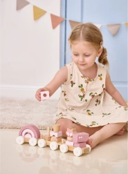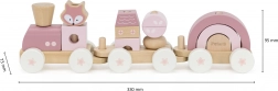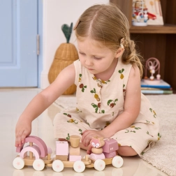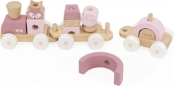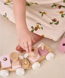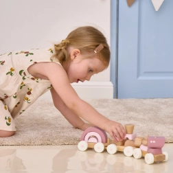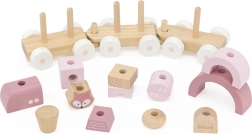 Schattig roze houten treintje uit de PolarB-lijn van Viga waar elk kind blij van wordt. Bestaat uit 3 wagonnetjes en 14 blokken in verschillende vormen die vrij te combineren en stapelen zijn. Dankzij de zachte pastelkleuren, het veilige houten ontwerp en de prettige vormen is het ideaal voor het ontwikkelen van fijne motoriek, coördinatie en creativiteit vanaf 18 maanden.