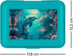 Houd je voedsel vers en veilig opgeslagen met deze prachtig ontworpen lunchbox met een dolfijnmotief. De enkele sluiting zorgt ervoor dat de inhoud veilig binnen blijft. De interne scheidingswand laat je toe om je eten op een efficiënte manier te organiseren, volgens jouw behoeften.