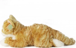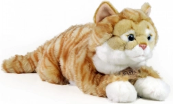 De pluchen kat heeft details die een echte kat natuurgetrouw nabootsen, inclusief blauwe ogen en een helder oranje vachtkleur.