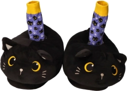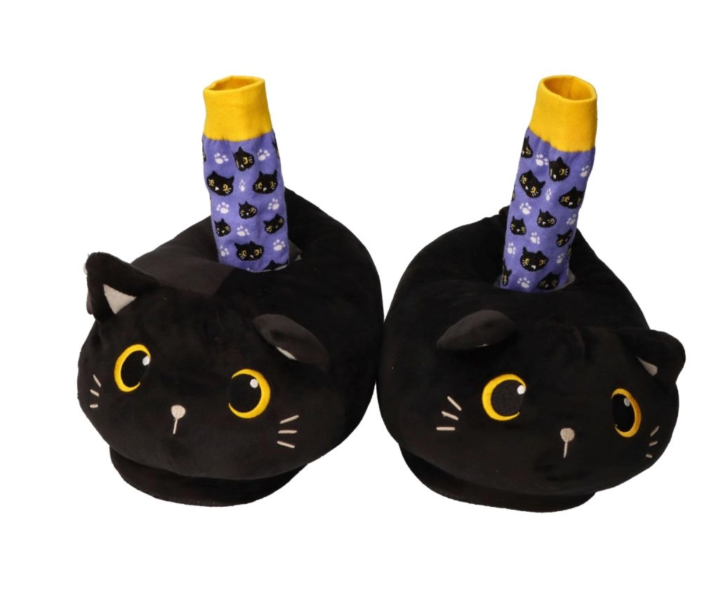 Geborduurde gele ogen, oortjes en snorharen geven de pantoffels een uniek uiterlijk dat zowel kinderen als volwassenen zal bekoren.