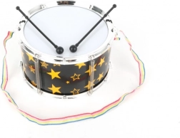 Gele trommel met zwarte sterren en een multicolor schouderriem, visueel aantrekkelijk voor kinderen.