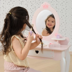 Deze roze‑witte kaptafel van hoogwaardig hout biedt kinderen een veilige plek voor fantasierijk make‑up en haarstyling. De ovale spiegel met kroonmotief, schattige hartjesdetails en het stabiele krukje zorgen voor een sprookjesachtige sfeer in de kamer.