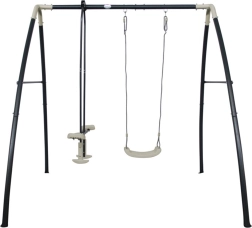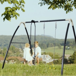 De AXI tuinschommel biedt een enkele en dubbele schommel waarop tot drie kinderen tegelijk kunnen schommelen. Het metalen frame is weerbestendig en geschikt voor kleinere tuinen.