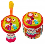Op de bovenkant van de kubus bevindt zich een muziekpaneel met knoppen die geluiden en diereniconen afspelen. Deze geluiden trekken direct de aandacht van het kind en helpen het oorzaak en gevolg te begrijpen. Andere interessante elementen zijn onder meer kleurrijke tandwielen om mee te spelen, een spiegeltje en een zachte opening voor het inwerpen van blokjes.