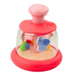 Door op de roze knop bovenop te drukken begint de draaimolen te draaien en de dieren beginnen om hun as te draaien, waardoor een dynamische en kleurrijke draaimolen ontstaat. Dit speelgoed betrekt het zicht, het gehoor en de beweging van het kind, waardoor oog-handcoördinatie en begrip van causaliteit worden ontwikkeld.