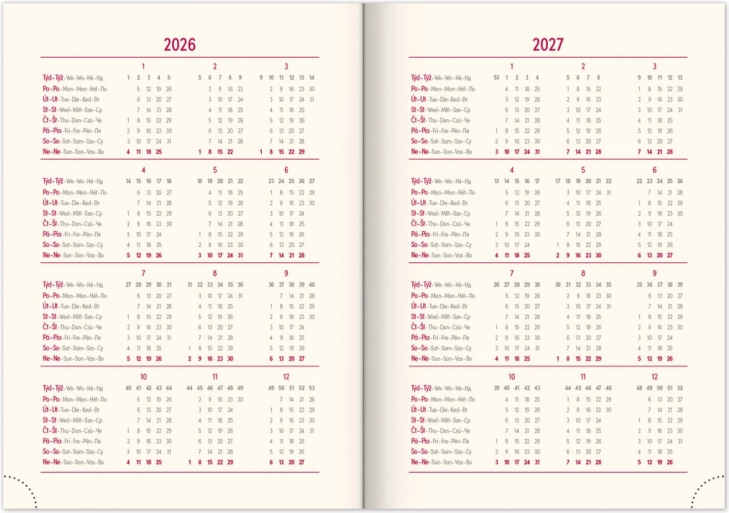 Notique Panama weekagenda 2026 in een rode uitvoering is de ideale partner voor het plannen van je tijd. Met een subtiele oppervlaktetextuur, geschikt voor alle soorten blinddruk, en voorzien van een Tsjechisch-Slowaaks kalendarium met aanvullende talen.