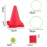 - 6 kunststof kegels; 6 ringen Ø 14 cm; 6 ringen Ø 16 cm; 6 zachte werpzakjes; 6 plastic balletjes; draagnet