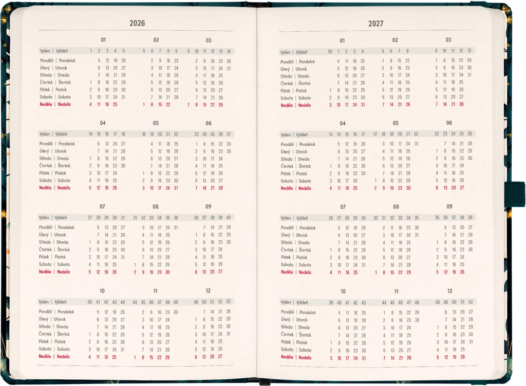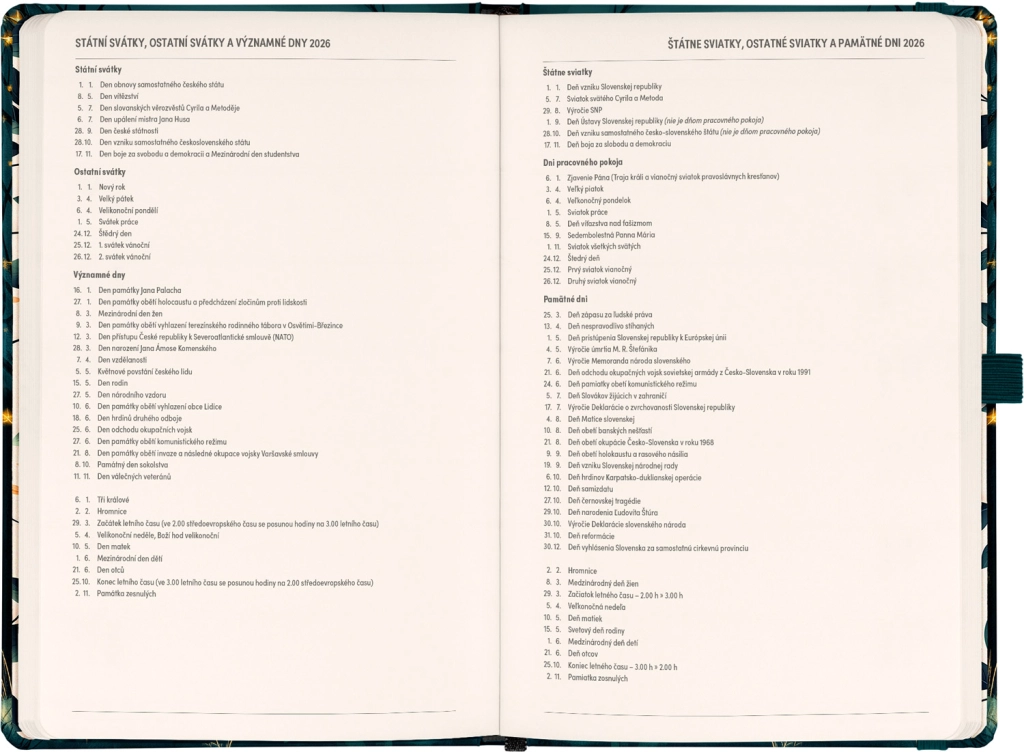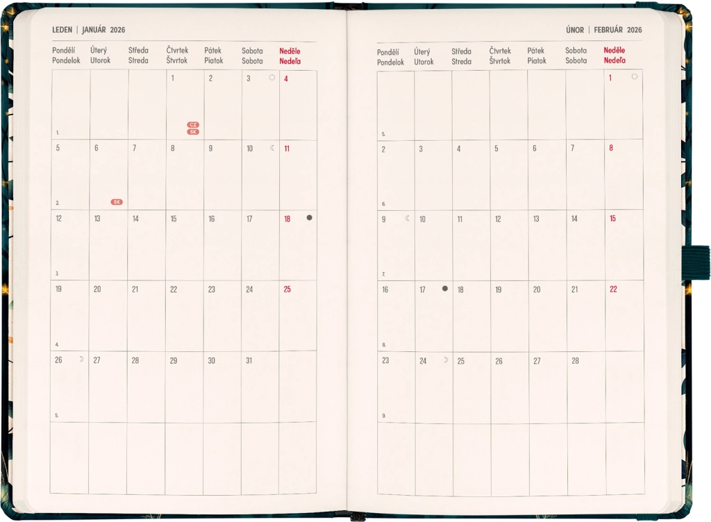 Geniet van de ideale verbinding van agenda en notitieboek met PLANBOOK. De eerste helft bevat een veertiendaags horizontaal kalendarium met Tsjechische en Slowaakse feestdagen, waarmee u iedere dag zorgvuldig kunt plannen. De tweede helft met gelinieerde pagina’s is perfect om al uw notities, ideeën of projecten vast te leggen.