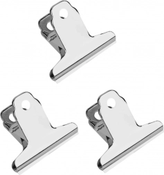Wij presenteren een set van drie robuuste clips van gegalvaniseerd metaal met hoge drukbestendigheid. Deze clips hebben gladde randen, een veermechanisme en een opening om op te hangen, waardoor ze een praktisch hulpmiddel zijn voor dagelijks gebruik.
