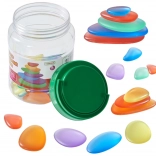 De set bevat 36 elementen in 6 levendige kleuren (geel, rood, blauw, groen, oranje, paars), in verschillende maten tot een diameter van 8,5 cm voor de grootste steen. Ongelijkmatige/asymmetrische vormen zijn ideaal voor artistieke composities, het aanleren van begrippen als groter–kleiner, boven–onder en het oefenen van oog–handcoördinatie.