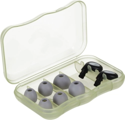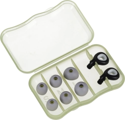 - 1× paar oordopjes (links en rechts), 6× siliconen dopjes (S, M, L), 1× etui, gebruiksaanwijzing
