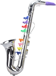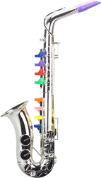 De zilveren kindersaxofoon met gekleurde kleppen biedt kinderen hun eerste stap in de wereld van muziek. Eenvoudige bediening zonder batterijen maakt direct spelen mogelijk, experimenteren met klanken en het leren van eenvoudige melodieën. Een geweldige keuze voor kleine muzikanten en als origineel cadeautje.