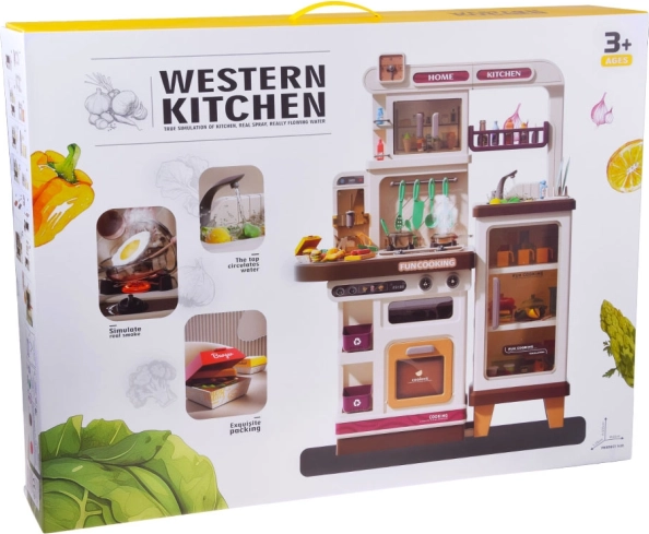 Deze ruime kinderkeuken past mooi in de kinderkamer of speelhoek en brengt dankzij de realistische functies de wereld van het koken dichter bij kinderen. De interactieve kookplaat biedt twee modi – kookgeluid met brandende LED of stoom-/rookeffect met geluid. Verder zijn er een oven die open kan, kastjes, beweegbare klokwijzers en een waterdispenser om een bekertje te vullen, evenals een pompkran voor echt water.