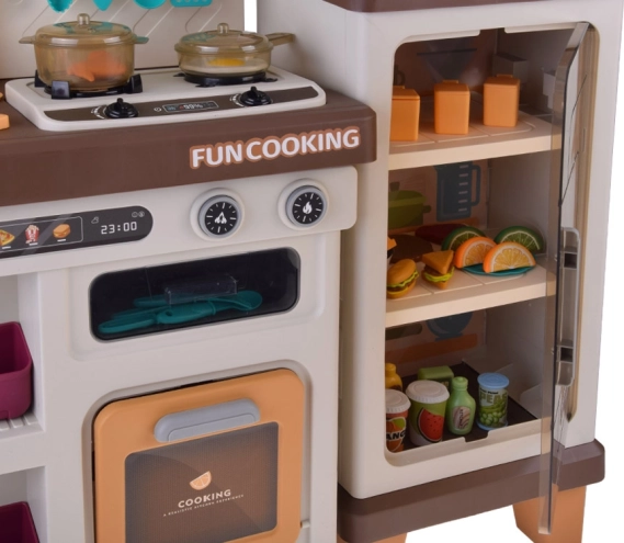 Grote kunststof kinderkeuken in zachte tinten met realistische licht- en geluidseffecten, stoom uit de brander en een werkende pompkran voor water. Deurtjes die open kunnen, beweegbare klokwijzers en rijk accessoires bevorderen creatief spel, motorische ontwikkeling en het spelenderwijs leren van huishoudelijke taken.
