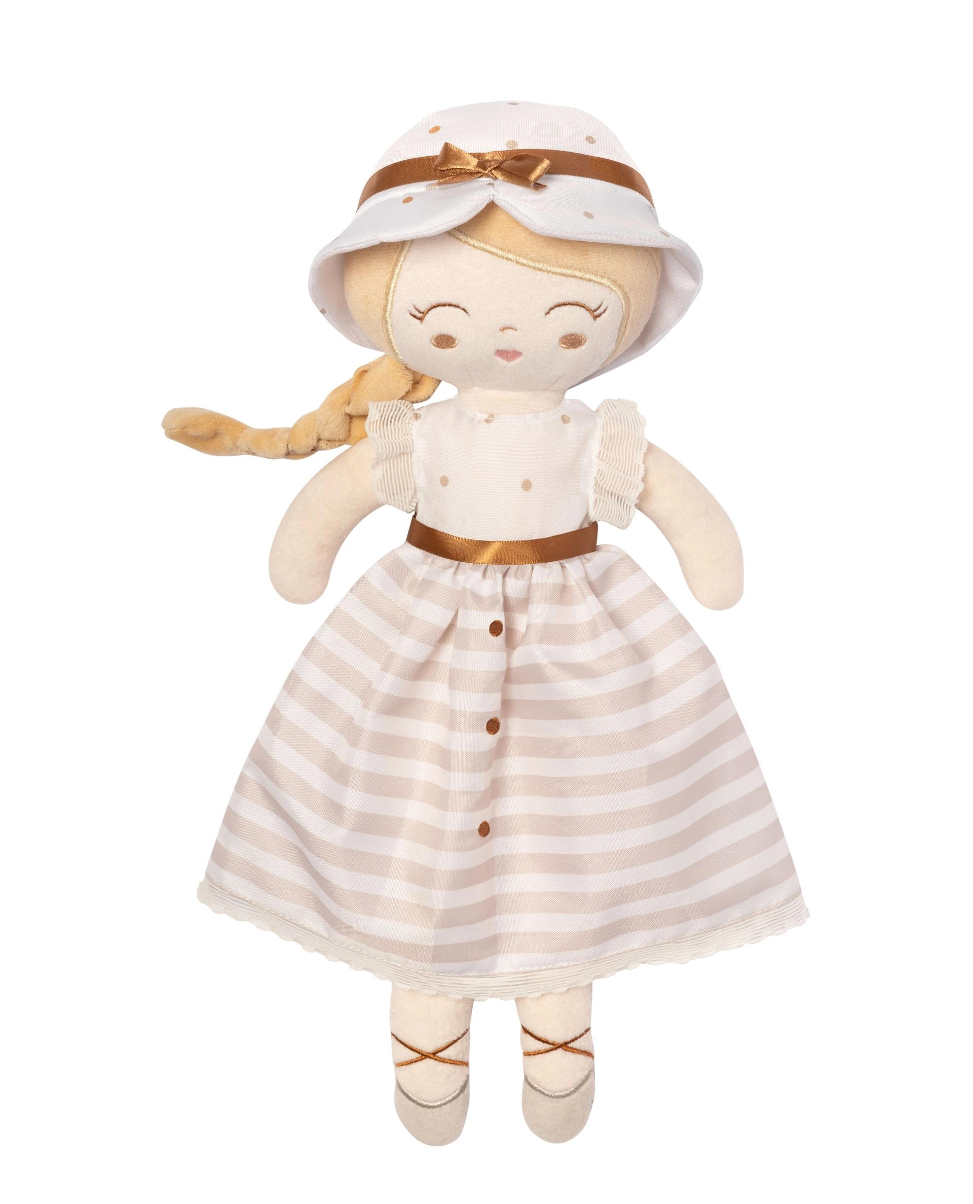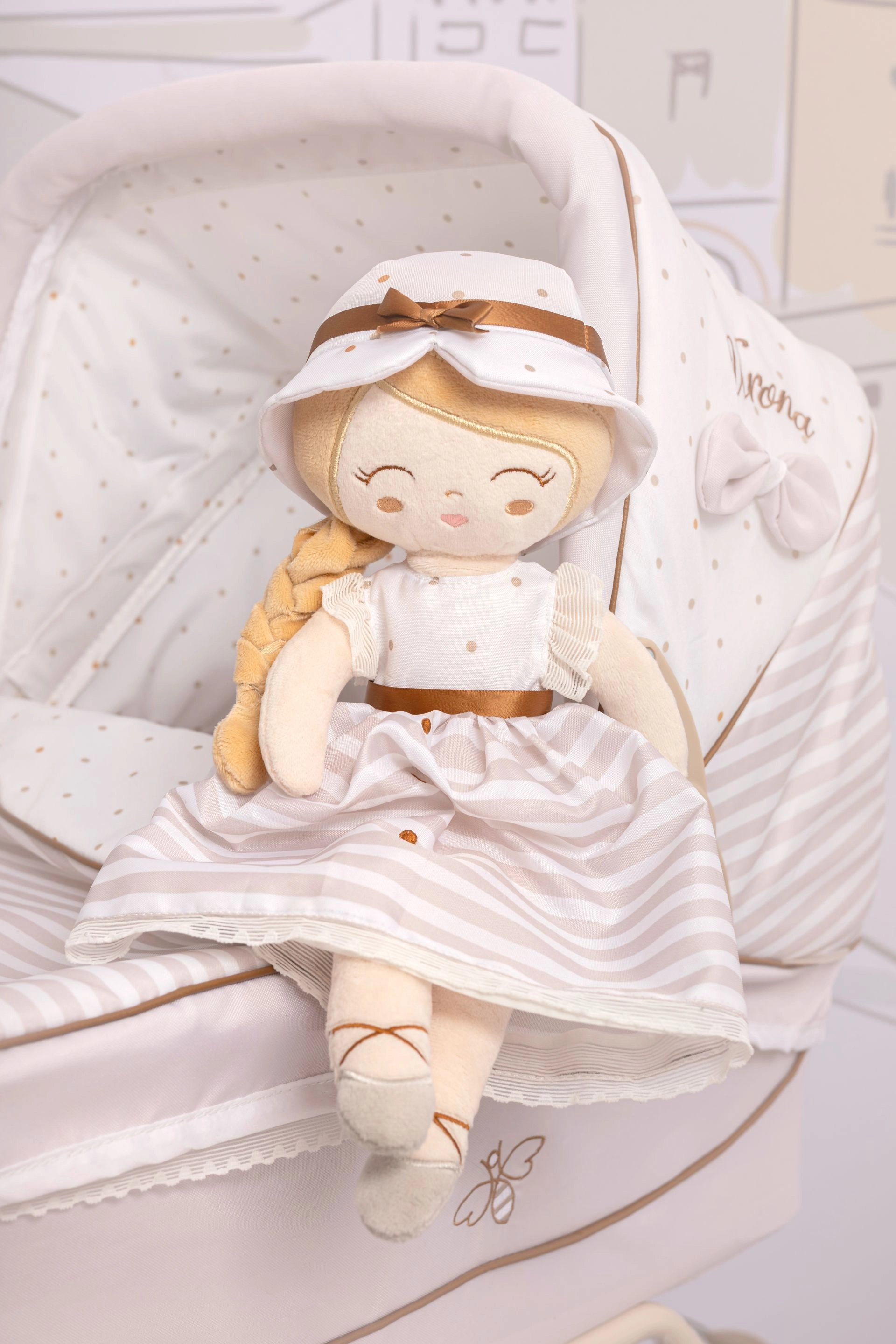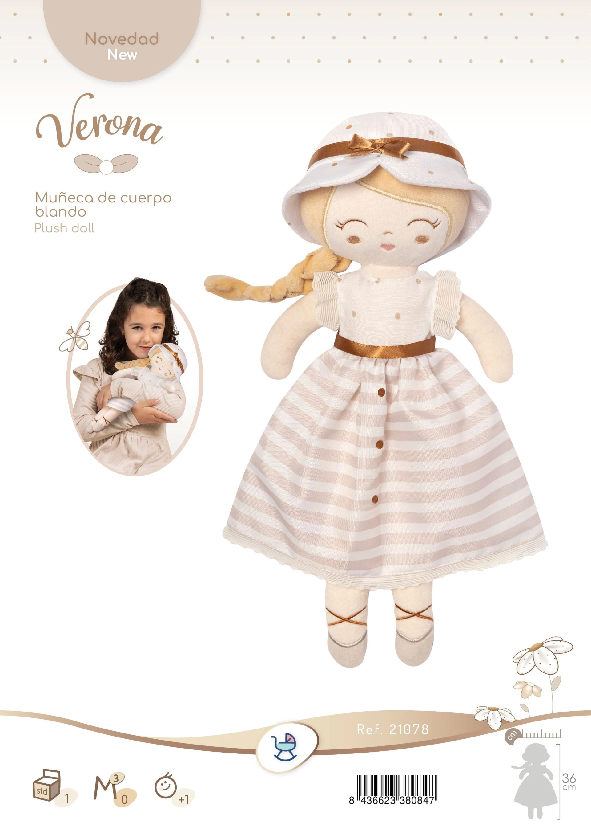 De pluchen pop Verona 36 cm is een klein vriendinnetje geïnspireerd door natuurlijke tinten en subtiele patronen, met een tijdloze uitstraling. De combinatie van lichtbeige en wit met stippen of strepen, aangevuld met fijne biezen, onderstreept het elegante Spaanse design. De pop is gemaakt van hoogwaardige, gladde, glanzende pluche die prettig aanvoelt en geschikt is voor dagelijks spelen.