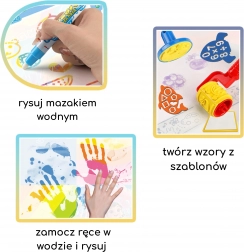 De set bevat rijkelijk accessoires die het speelplezier vergroten – van waterstiften en stempels tot een patroonroller en sjablonen met letters en vormen. Alles is licht, compact en geschikt voor thuis en onderweg.