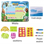 De set bevat alles wat je nodig hebt: de watertekenmat, 3 herbruikbare waterstiften, 4 sjablonen, 2 stempels en een boekje met voorbeelden. Perfect als cadeau voor kleine kunstenaars en kleuters.
