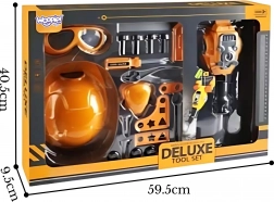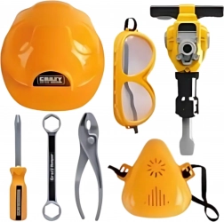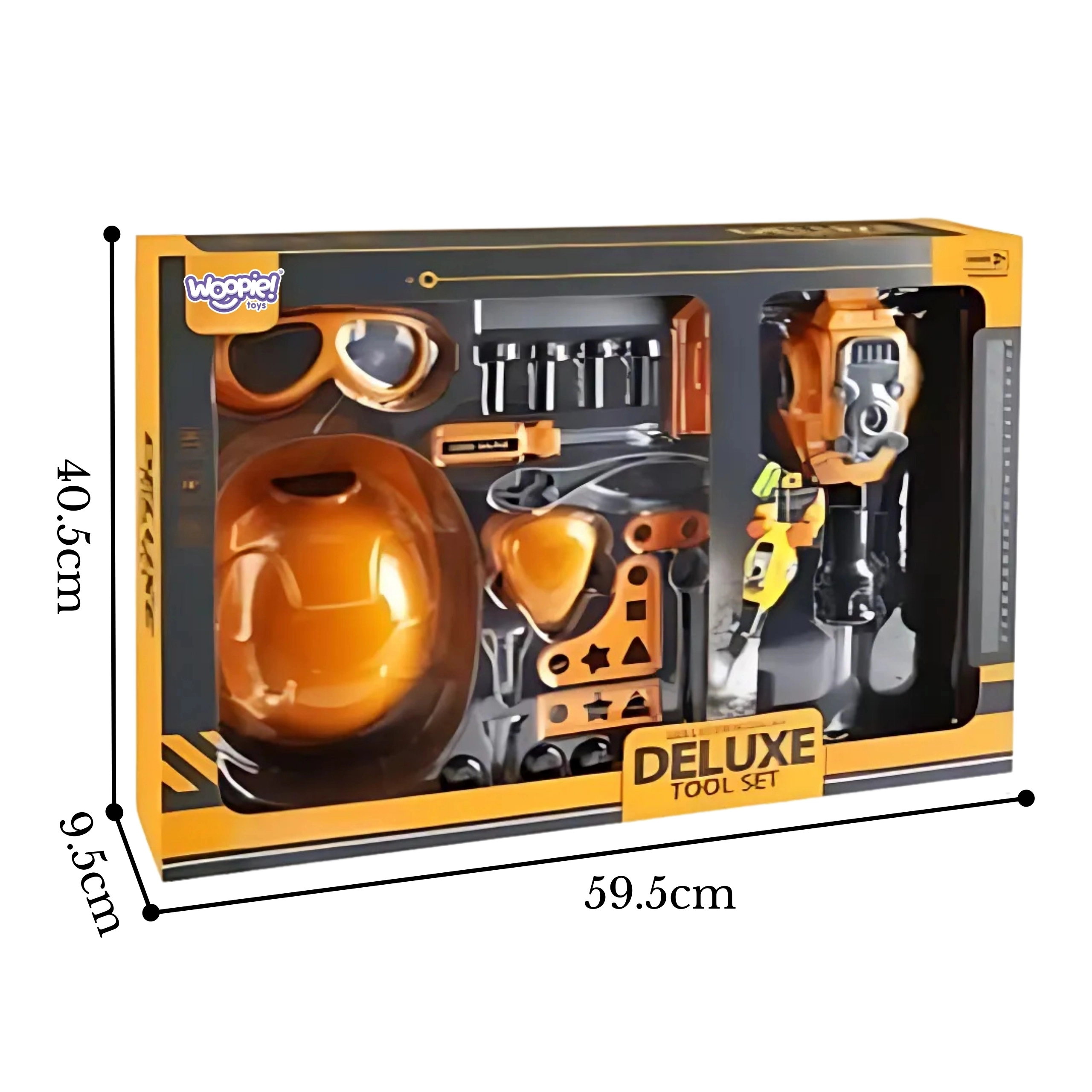 De complete set voor kleine klussers van het merk WOOPIE bevat een helm, veiligheidsbril, realistische batterij‑pneumatische hamer en veel gereedschap en onderdelen die de fantasie stimuleren, de motoriek ontwikkelen en aanzetten tot creatief spel. Dankzij de realistische effecten en de stevige uitvoering is hij ideaal voor lange uren speelplezier op een veilig “thuisklus-terrein”.