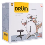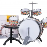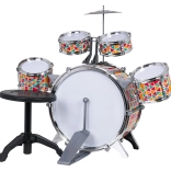 - grote drum met pedaal, 2× middelgrote drum, 2× kleine drum, metalen bekkentje, 2× drumstok, krukje