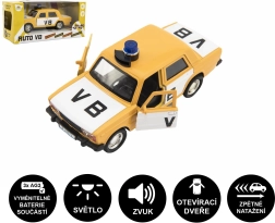 Het stijlvolle model van de VB Lada politiewagen maakt elke kleine agent blij. Voorzien van een terugtrekmotor, licht- en geluidseffecten, te openen voordeuren en een compacte lengte van 12 cm. Batterijen 3× AG3 zijn inbegrepen.