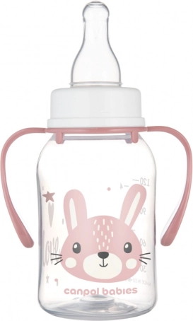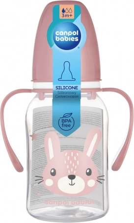 Lichte en duurzame smalhals babyfles van Canpol babies uit de collectie CUTE ANIMALS met een inhoud van 120 ml, voorzien van een siliconen speen en afneembare handgrepen voor eenvoudig vasthouden. De fles is volledig transparant, heeft een nauwkeurige maatverdeling voor controle van de hoeveelheid, is BPA-vrij en compatibel met alle Canpol babies borstkolven. Geschikt voor vaatwasser, sterilisator en magnetron.