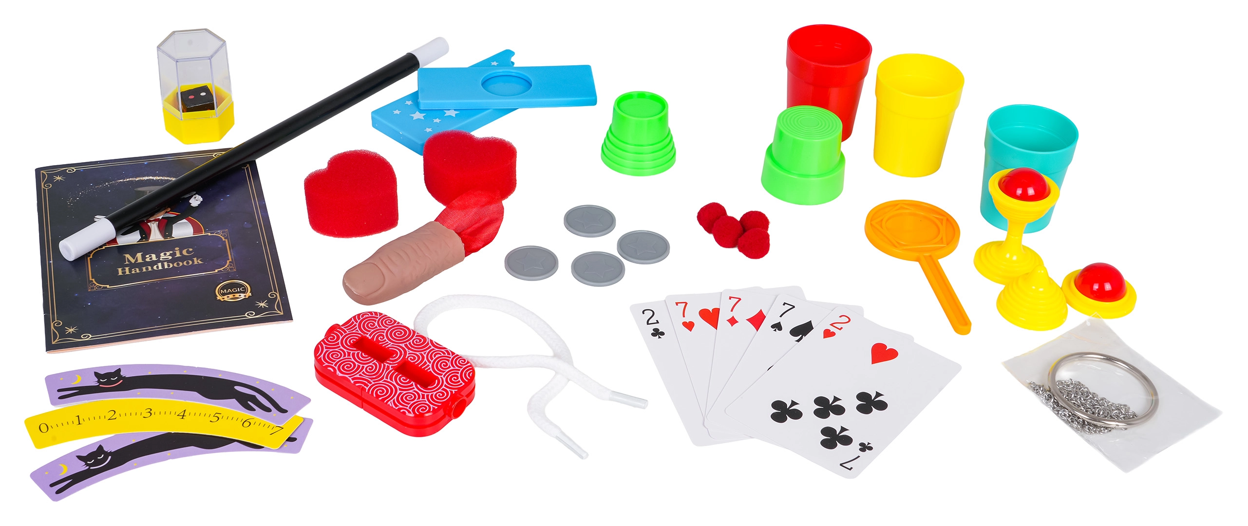 In de doos vind je diverse goochelbenodigdheden – van een goochelstok, bekers en munten tot speciale rekwisieten om de aandacht van het publiek te bespelen. Elke truc is duidelijk uitgelegd en aangepast voor kinderen, zodat ze succes ervaren en zelfvertrouwen opbouwen.