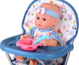 Stabiele, opklapbare stoel met blad en plek voor kom en bestek. Ondersteunt realistisch spel met voeren en tafelen met de pop.