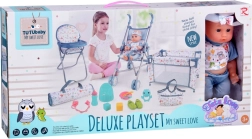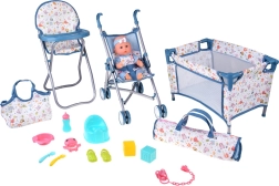 - Set voor poppen – babypop met kinderwagen, bedje, kinderstoel en accessoires